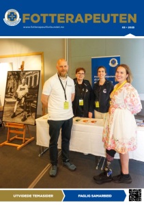 4 | FOTTERAPEUTEN 3 – 2025 Utgiver: Fotterapeutforbundet Redaktør: Anette Haugen anette@fotterapeutforbundet.no For saker til redaksjonen E-post: post@fotterapeutforbundet.no Tlf. 90 77 20 67 Redaksjon Sentralstyret Annonseansvarlig Kristin A. Knudsen Tlf. 91 30 33 33 E-post: post@fotterapeutforbundet.no Annonsepriser 1/1 side kr. 10 610 eks. mva 1/1 side baksiden kr. 11 213 eks. mva 1/2 side kr. 7 388 eks. mva 1/4 side kr. 4 736 eks. mva Rubrikkannonser Kr. 300,- for medlemmer Kr. 500,- for ikke-medlemmer Alle priser eks. MVA Send tekst, maks 40 ord, til post@fotterapeutforbundet.no Annonsemateriell Digitalt, pdf eller eps. Utbedring/ferdiggjøring av uferdig materiell belastes annonsøren. Opplag: 1.200 Abonnement kr. 600,- pr.år Forsidefoto: Anette Haugen Redaksjonen tar gjerne i mot ditt innlegg. Vi forbeholder oss retten til å redigere og forkorte alle tilsendte innlegg. Kronikk: maks 4000 tegn inkl. mellomrom Leserinnlegg: 2000 tegn inkl. mlm Replikk: 400-1500 tegn inkl. mlm Design og trykk: Merkur Grafisk AS Merkur Grafisk er godkjent som svanemerket bedrift. FOTTERAPEUTFORBUNDET SVANEMERKET Komitéer og utvalg Fotterapeutforbundet Postadresse: Pb. 9202 Grønland, 0134 Oslo Sekretariat: Lakkegata 23, 0187 Oslo Tlf. 91 30 33 33, telefontid 10-12 man-tors, e-post: post@fotterapeutforbundet.no Bankgironummer: 1644 01 65382 - Org.nummer: NO 970 443 207 www.fotterapeutforbundet.no Oslo/Akershus: Ann-Kristin Naverud Skogveien 11 A 1467 Strømmen 91310973 strommen@basisfot.no Agder: Siri Berge Eidshaven 52 4634 Kristiansand S 91921121 mandal@aktivfot.no Buskerud: Camilla Madland Skjæret 21 3410 Sylling 94807410 camilla.madland@gmail.com Innlandet: Elisabeth Mathisen Sigrid Undsets veg 4 2827 Hunndalen 41371954 Elisabeth@stasnytovet.no Vestland: Claudia Garces Skulevegen 6 B 5265 Ytre Arna 948 29 848 claxigato@hotmail.com Nordland/Troms/ Finnmark: Frida Løvestad Johansen Sømnesåsen 14 8920 Sømna 41559541 fridalovestad@hotmail.com Møre og Romsdal: Venke Guldis Pilskog Digernesbakkane 20 6160 Hovdebygda 90943580 venkeg@hotmail.com Rogaland: Joanna Sobon Parkveien 25 K 4307 Sandnes 99267746 Joanna.natalia1988@gmail.com Telemark: Kjersti Vaagsland-Homleid Homleidveien 98 3753 Tørdal 91868761 puasen76@gmail.com Trøndelag: Berit Kåsen Stugudalsvegen 2160 7590 Tydal 91777268 berit.kasen@gmail.com Vestfold: Cathrine Werge Thorsen Langestrandhagen 8 3222 Sandefjord 47371532 Cathy_79_@hotmail.com Østfold: Gerd Anita Karlsen Josefsbakken 9 1619 Fredrikstad 99008243 gerdanitak@gmail.com Sentralstyret Kretsledere- og kontakter Valgkomité Siri Berge Eidshaven 52 4634 Kristiansand S 91921121 mandal@aktivfot.no Valgkomité: Iverna Veidahl Pålsrødveien 16 1570 Dilling 97675605 vippedama@gmail.com Valgkomité Monica Ruud Leithe Fosnesvegen 527 7856 Jøa 92046328 monica.leithe@faksdal.no Kontrollkomité Heli Kankaanpää Sofienberggata 55 A 0563 OSLO 47241741 fot@verdiggange.no FMS Siri Berge Eidshaven 52 4634 Kristiansand S 91921121 mandal@aktivfot.no Styremedlem Torild Tjensvold Tunglandsveien 21F 4100 Jørpeland 99699350 torild.tjensvold@ gmail.com Nestleder Randi S. Nyland Hennumvegen 3 3408 Tranby 99704341 randi@nylandas.no Styremedlem Mette Kverme Munkerekkveien 108 3142 Vestskogen 92251869 mkverme@gmail.com Styremedlem Håvard Høydahl Sponstubben 55 1414 Trollåsen 99021801 hhoydahl@gmail.com 1. Vara Ann-Kristin Naverud Skogveien 11 A 1467 Strømmen 91310973 strommen@basisfot.no 2. Vara Solveig Bekk Sven Morens Veg 26 2408 Elverum 99461295 solveig.bekk@outlook.com 3. Vara Hege Howden Prestegårdsveien 50 4371 Egersund 99106716 h-howde@online.no Kontrollkomité Denise Ann Jenner Østerøya 169 4625 Flekkerøy 98846377 Deniseannjenner@gmail.com IFID Mariann Blegen Kalkfjellet 59 1387 Asker 40201502 mariann@abfot.no Forbundsleder: Inger Margaret Paulsen Stubbveien 35, 3208 Sandefjord 99240308 inger@fotterapeutforbundet.no 4 | FOTTERAPEUTEN 3